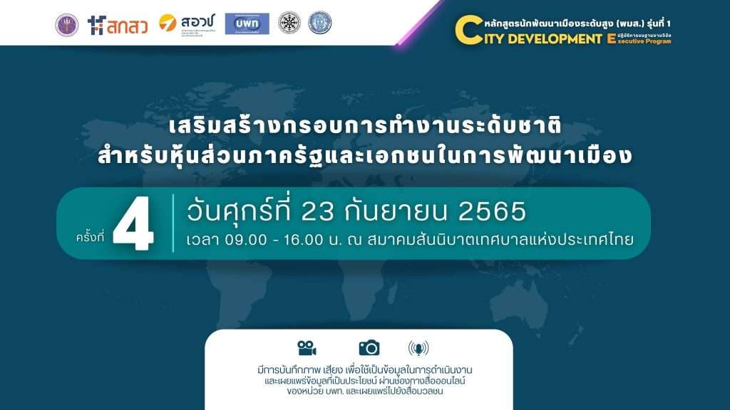 โดยในวันที่ 23 กันยายน 2565 เวลา 09.00 น. – 16.00 น. หลักสูตรประกาศนียบัตรนักพัฒนาเมืองระดับสูง (พมส.) รุ่นที่ 1 หลักสูตรที่อิงอยู่บนฐานคิดประสบการณ์ของทุกคน ได้จัดการอบรมเชิงปฏิบัติการพัฒนาเมือง ภายใต้หัวข้อ “เสริมสร้างกรอบการทำงานระดับชาติ สำหรับหุ้นส่วนภาครัฐและเอกชนในการพัฒนาเมือง” ครั้งที่ 4 ขึ้น ณ สมาคมสันนิบาตเทศบาลแห่งประเทศไทย โดยการสนับสนุนของหน่วยบริหารและจัดการทุนด้านการพัฒนาระดับพื้นที่ กรอบการวิจัยยกระดับองค์กรปกครองส่วนท้องถิ่น ร่วมกับมูลนิธิส่งเสริมการปกครองท้องถิ่นร่วม และสมาคมสันนิบาตเทศบาลแห่งประเทศไทย สำหรับการอบรมเริ่มต้นด้วยการ เล่าวิสัยทัศน์การพัฒนา และบรรยายยาพิเศษพร้อมยกตัวอย่างกรณีตัวอย่างให้เห็นภาพชัดขึ้น ให้กับผู้เข้ารับการอบรม ซึ่งประกอบด้วย ผู้บริหารท้องถิ่นและภาคีพัฒนาพื้นที่จากทั่วประเทศ จำนวนกว่า 150 คนที่เข้าร่วมทั้งรูปแบบออนไลน์ และออนไซต์