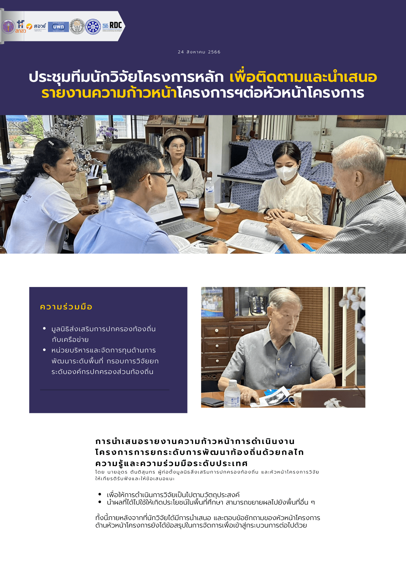 ประชุมทีมนักวิจัยเพื่อติดตามและนำเสนอรายงานความก้าวหน้าโครงการการยกระดับการพัฒนาท้องถิ่นด้วยกลไกความรู้และความร่วมมือระดับประเทศต่อหัวหน้าโครงการ