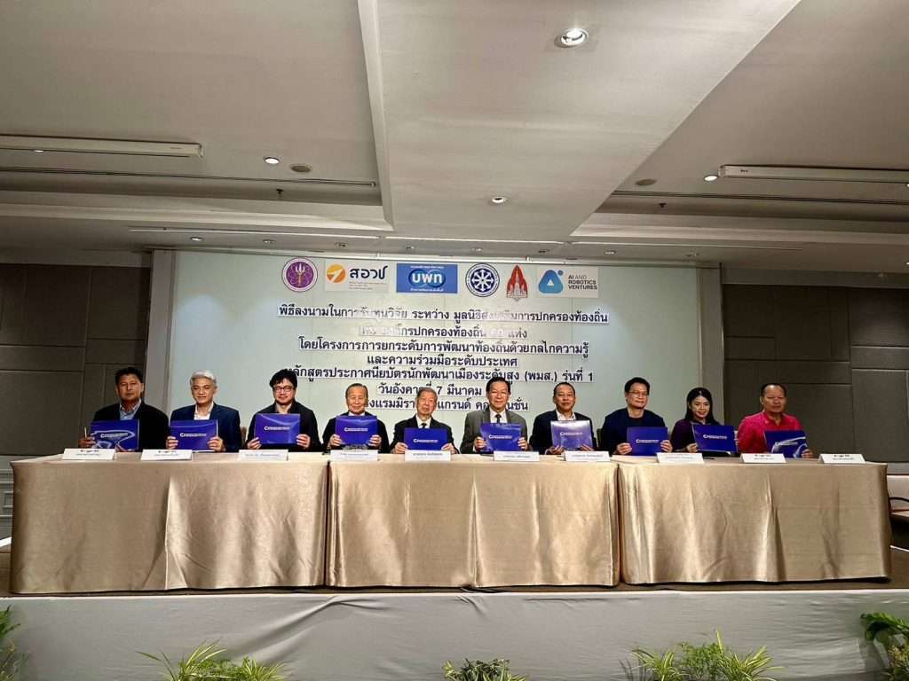 จากนั้นเป็นพิธีลงนาม บันทึกข้อตกลงความเข้าใจ (MOU) ว่าด้วย การพัฒนาและเผยแพร่แพลตฟอร์มดิจิทัลข้อมูลเมือง ระหว่าง มูลนิธิส่งเสริมการปกครองท้องถิ่น กับ บริษัท เอไอ แอนด์โรโบติกส์ เวนเจอร์ส จำกัด และ องค์กรปกครองส่วนท้องถิ่น 60 แห่ง และปิดท้ายด้วยการชี้แจงแนวทางการจัดทำรายงานการเงินโครงการวิจัย โดย หน่วยบริหารและจัดการทุนด้านการพัฒนาระดับพื้นที่ (บพท.) เพื่อให้องค์กรปกครองส่วนท้องถิ่น จำนวน 60 แห่ง อันมีนักวิจัยคือ ผู้ลงมือปฎิบัติการพัฒนาเมือง นำโดยนายกเทศมนตรี ในฐานะหัวหน้าโครงการวิจัย นักวิจัยร่วมกว่า 1,000 คน เกิดความเข้าใจเกี่ยวกับหลักการและสาระสำคัญของการจัดทำรายงานการเงินตามมาตรฐานของ บพท. ให้มีความถูกต้องครบถ้วน